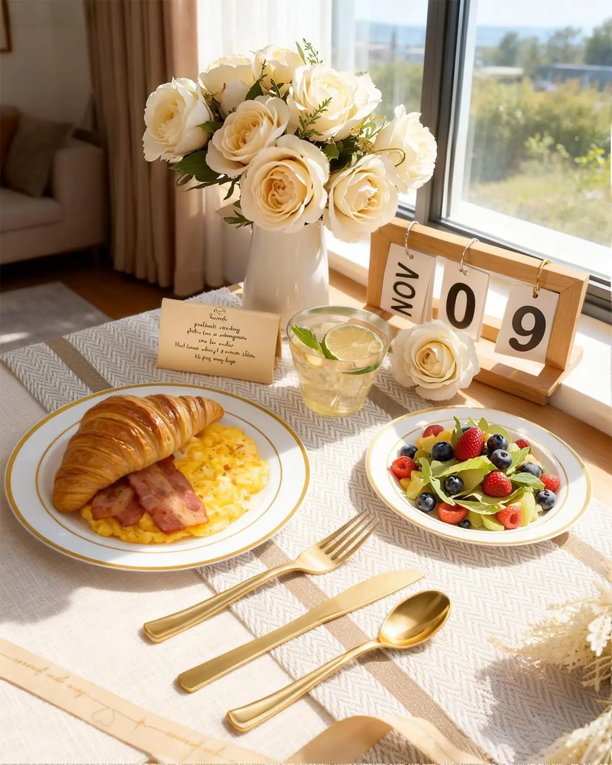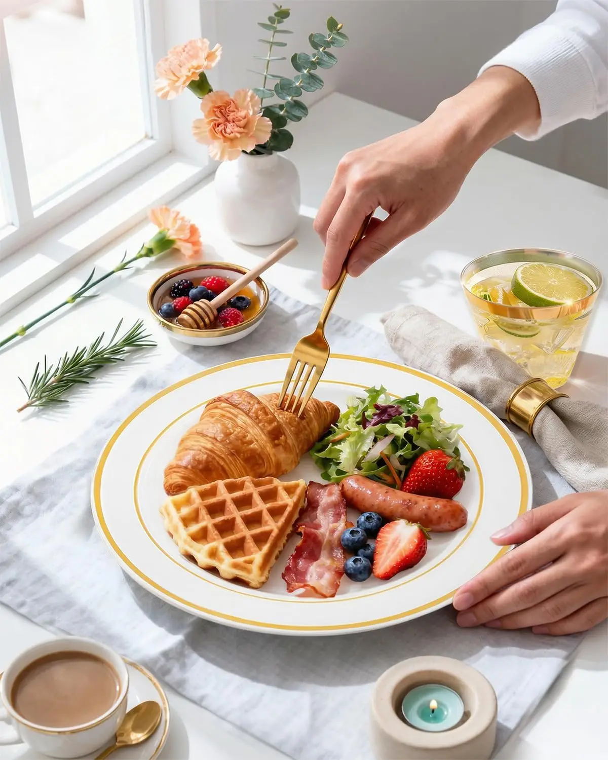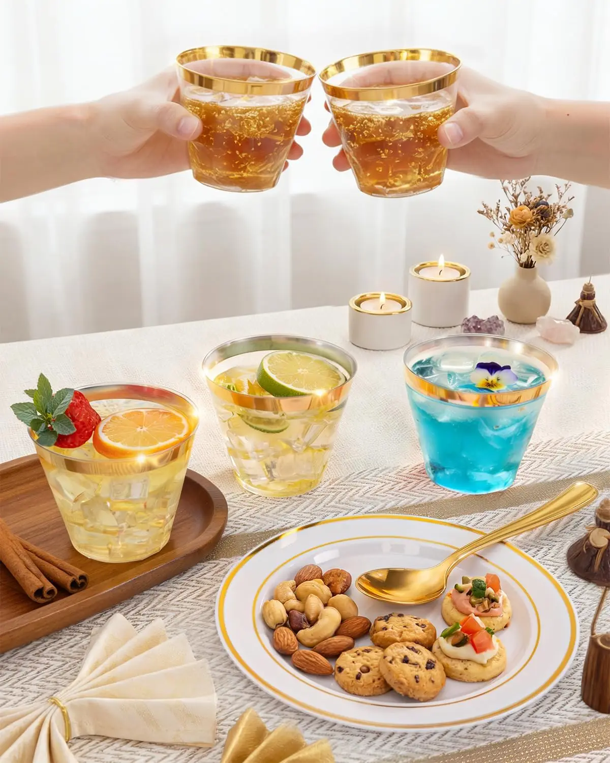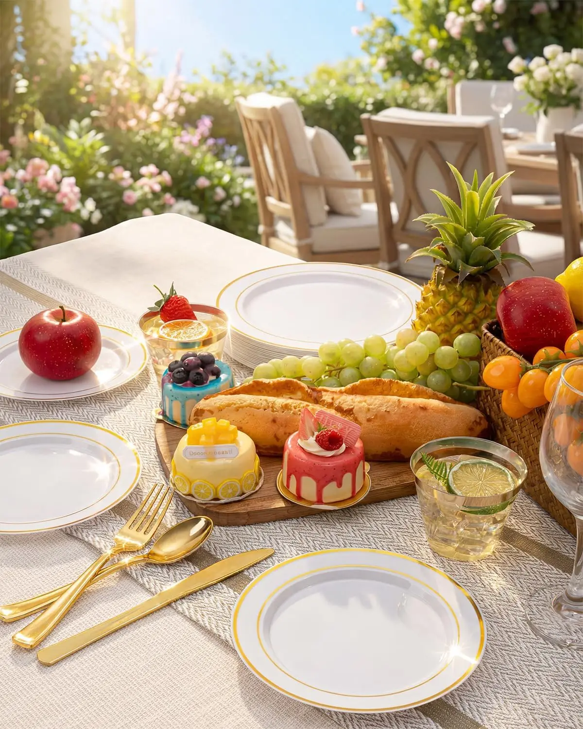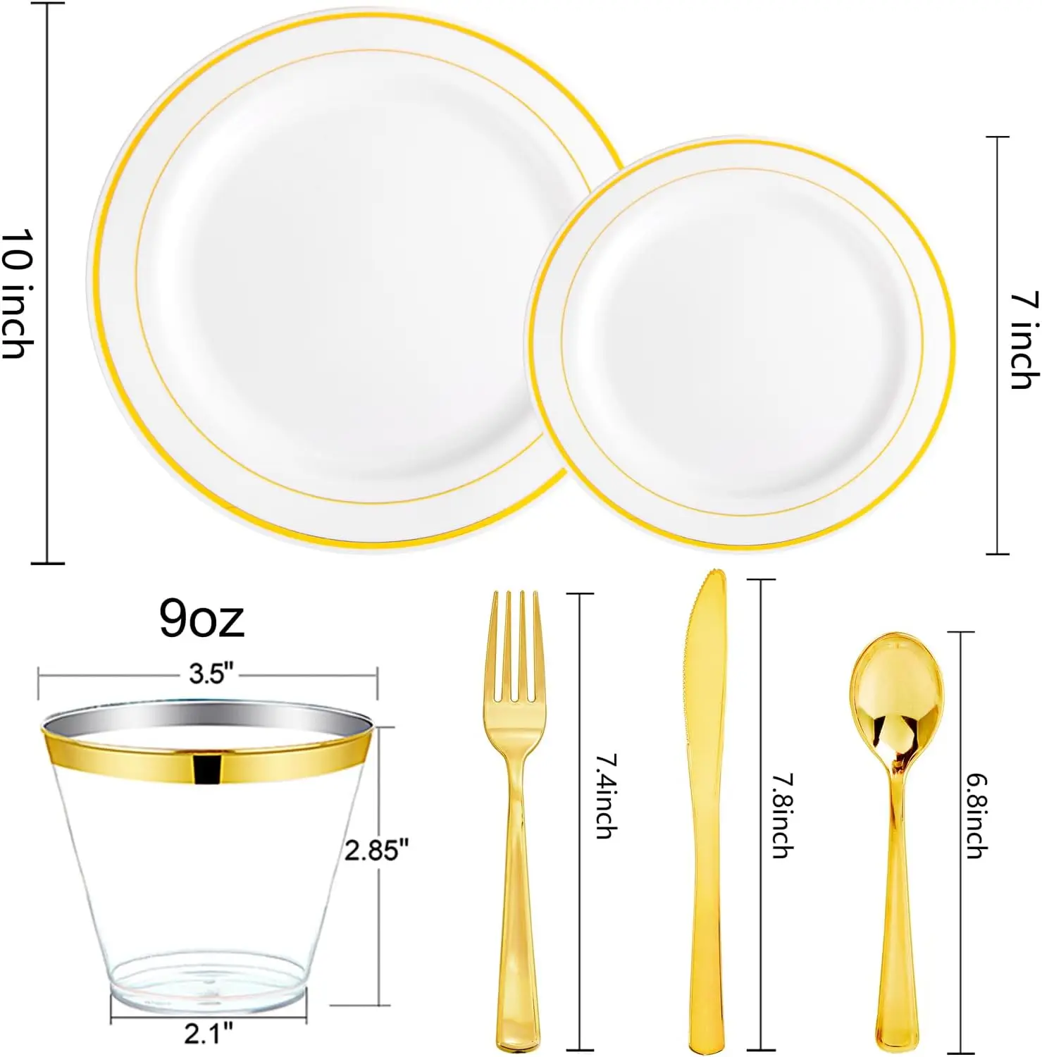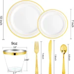 Elevate your special occasions with our premium gold plastic disposable dinnerware set. This comprehensive package includes everything you need to host a memorable event without the hassle of cleanup. Key Features: – **Food-Grade Safety**: Crafted from 100% BPA-free plastic, these plates are odorless and free from toxic chemicals, ensuring a healthy dining experience for all guests. – **Durable Construction**: Designed to be lightweight yet sturdy, this dinnerware set can bear significant weight without breaking or wearing easily, providing reliable performance throughout your event. – **Complete Value Pack**: Enjoy a full set of 150 pieces: 25 dinner plates, 25 dessert plates, 25 forks, 25 knives, 25 spoons, and 25 elegant cups. Perfect for serving large groups efficiently. – **Elegant Design**: Featuring a simple yet sophisticated white base with stylish gold trim patterns, these plates add an elegant touch to any table setting. The beautiful appearance enhances the overall ambiance of your party or banquet. – **Versatile Use**: Ideal for various occasions such as weddings, birthday parties, holiday dinners, and banquets. Save time and energy on cleanup so you can focus on enjoying moments with friends and family. Benefits: – Conveniently disposable after use to reduce post-event workload. – Enhances the visual appeal of your dining area with its chic design. – Provides a cost-effective solution for hosting large gatherings without compromising on quality or style. Usage Tips: 1. Store in a cool, dry place before use to maintain freshness and integrity. 2. Pair with matching decorations to create a cohesive theme for your event. 3. Dispose responsibly according to local recycling guidelines if applicable. This gold plastic dinnerware set is designed to make hosting effortless while impressing your guests with its premium look and feel.