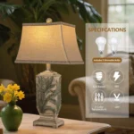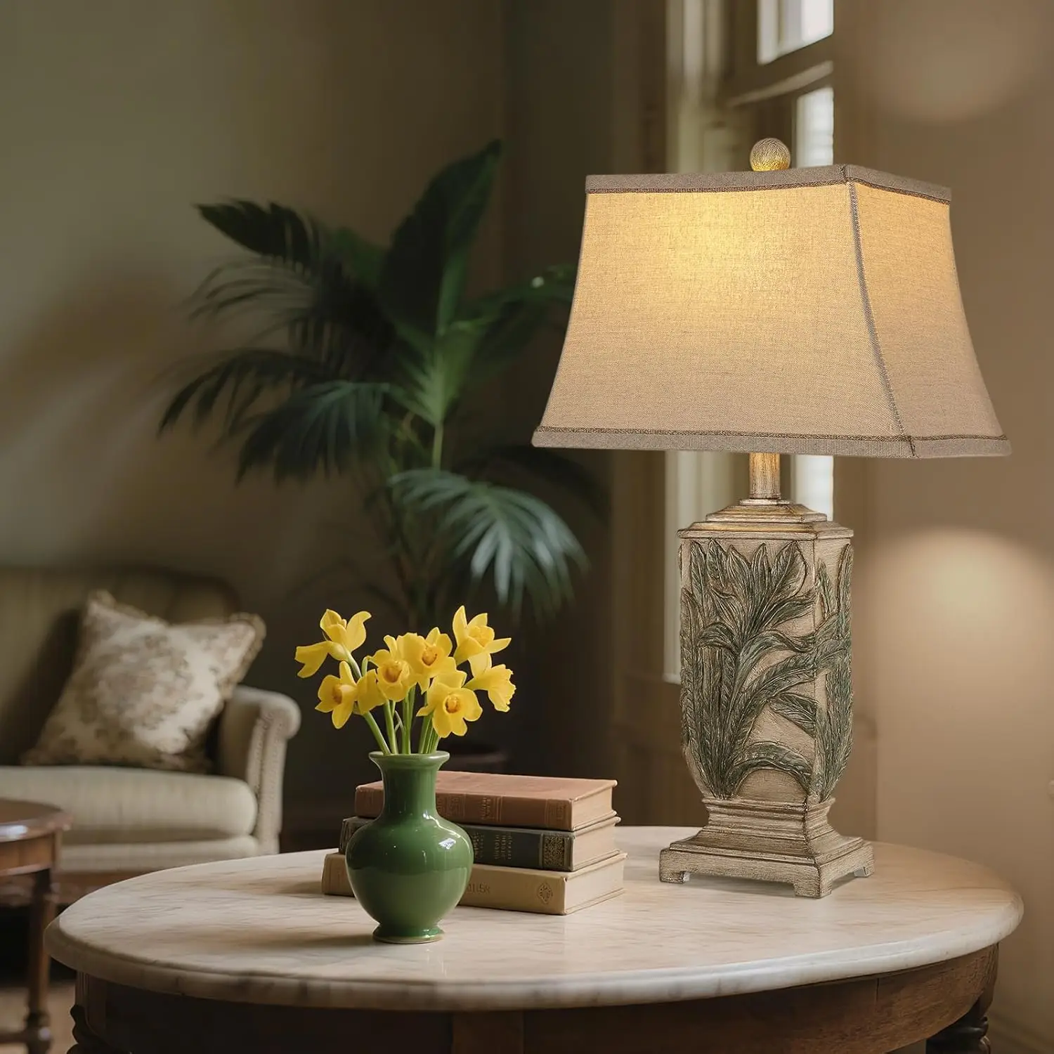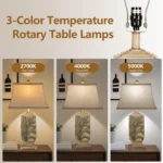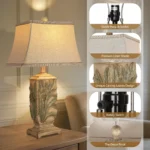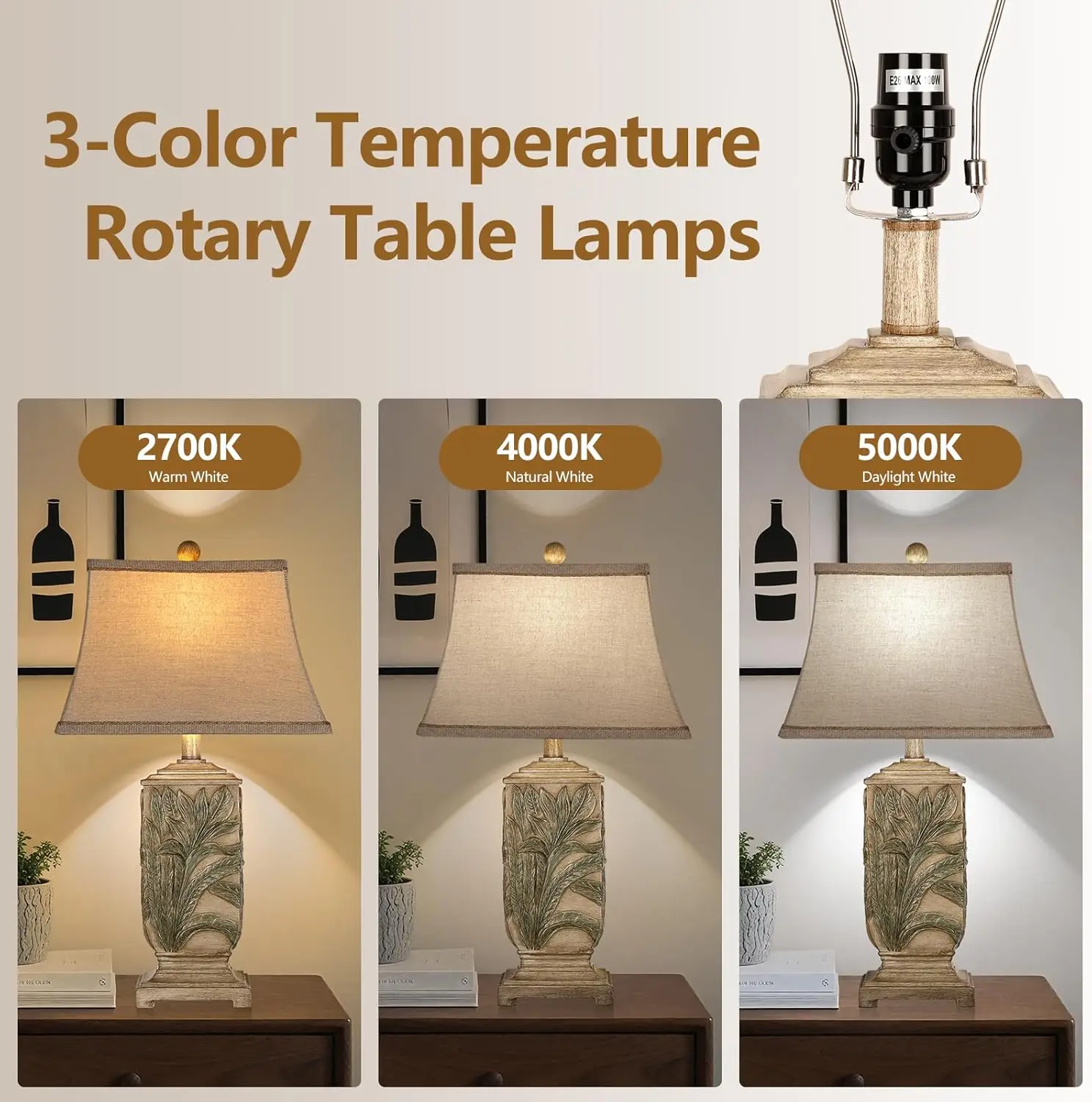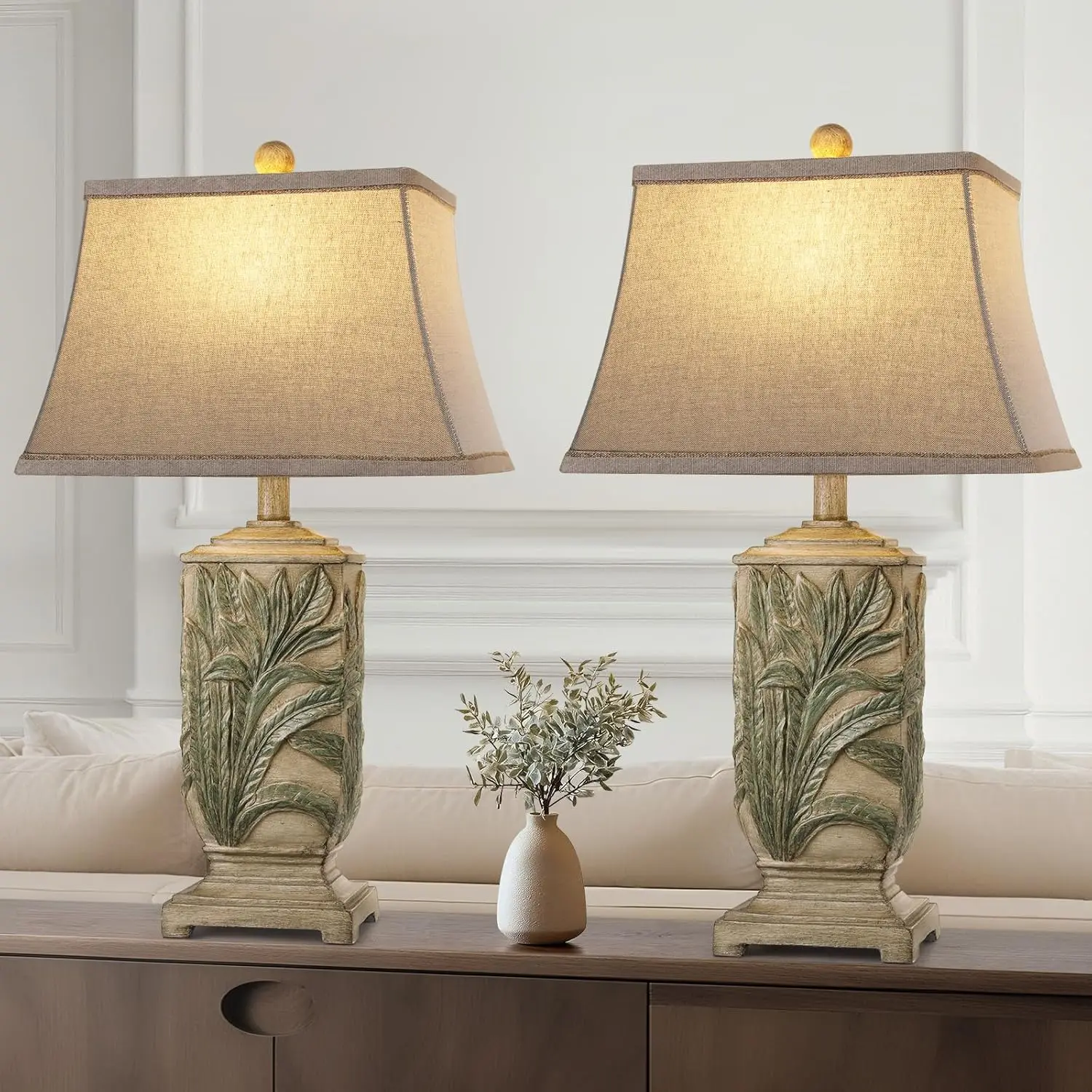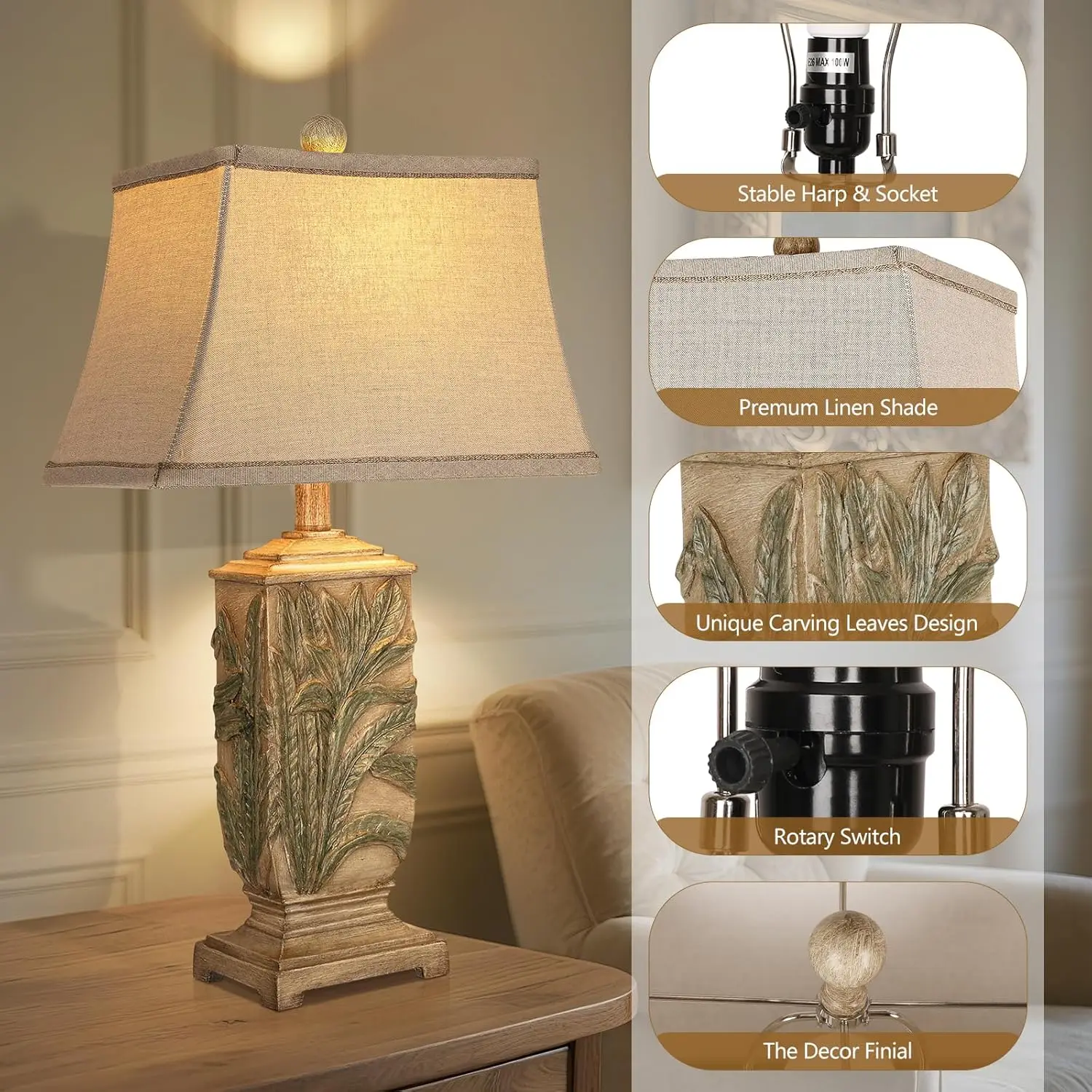 Enhance your home decor with our elegant vintage table lamps set. This pair of 25-inch tall lamps features a rustic retro design, perfect for adding a farmhouse charm to any room. Crafted from high-quality resin, they are durable and lightweight. Key Features: – **3 Color Temperature Options**: Adjust the lighting to suit your mood or activity with warm white, cool white, and daylight settings. – **Rotary Switch**: Easy-to-use rotary switch allows for seamless control of brightness and color temperature. – **Carved Leaf Design**: Intricate carved leaf patterns add a touch of nature-inspired elegance to the lamp base. – **Versatile Placement**: Ideal for living rooms, bedrooms, nightstands, or as accent pieces in hallways or offices. – **Complete Set**: Comes as a set of two lamps, providing balanced lighting and cohesive style for paired spaces like bedside tables. – **Bulbs Included**: Each lamp includes an energy-efficient bulb (specifications: standard base), ready to use out of the box—no need for additional purchases. Benefits: – Create a cozy ambiance in your bedroom with soft warm light for relaxing evenings. – Use cool white light in the living room for reading or tasks that require focus. – The farmhouse aesthetic complements various interior styles from traditional to modern rustic. – Durable resin construction ensures long-lasting use without fading or cracking over time. Perfect For: Homeowners looking to upgrade their lighting fixtures with stylish and functional pieces. Great as gifts for housewarmings or holidays. Elevate your space with these charming lamps that combine practicality with decorative appeal.