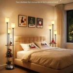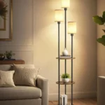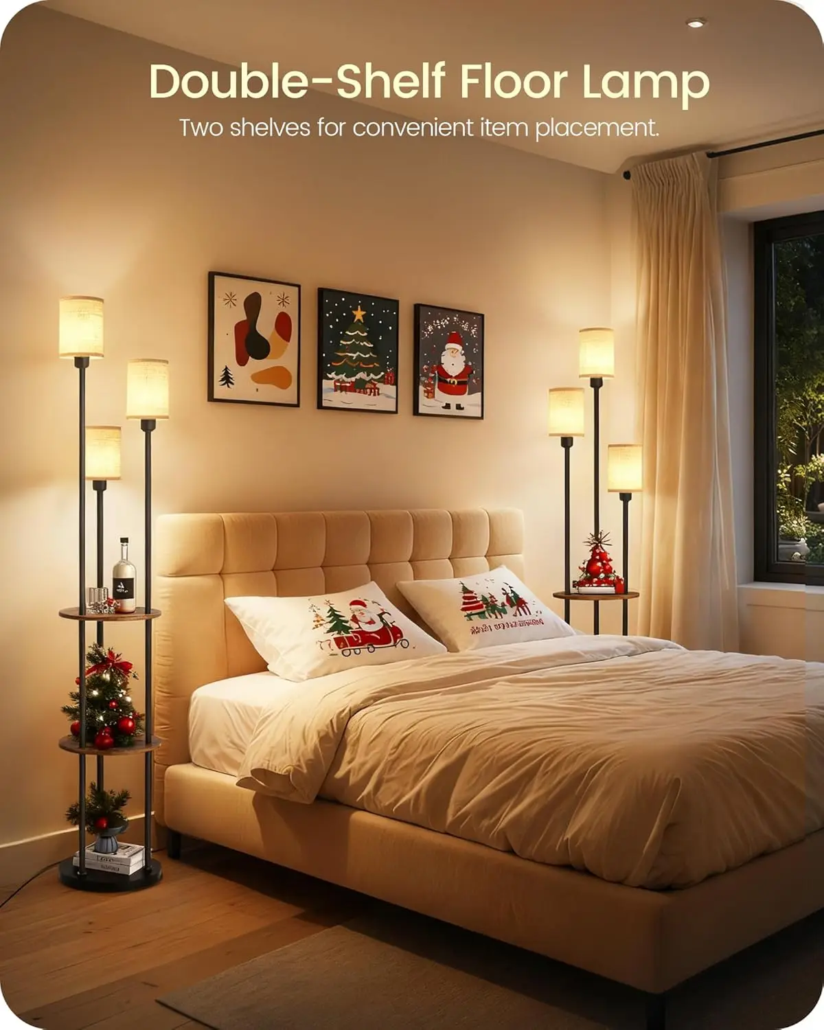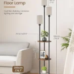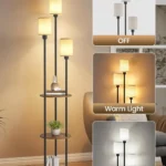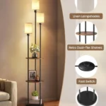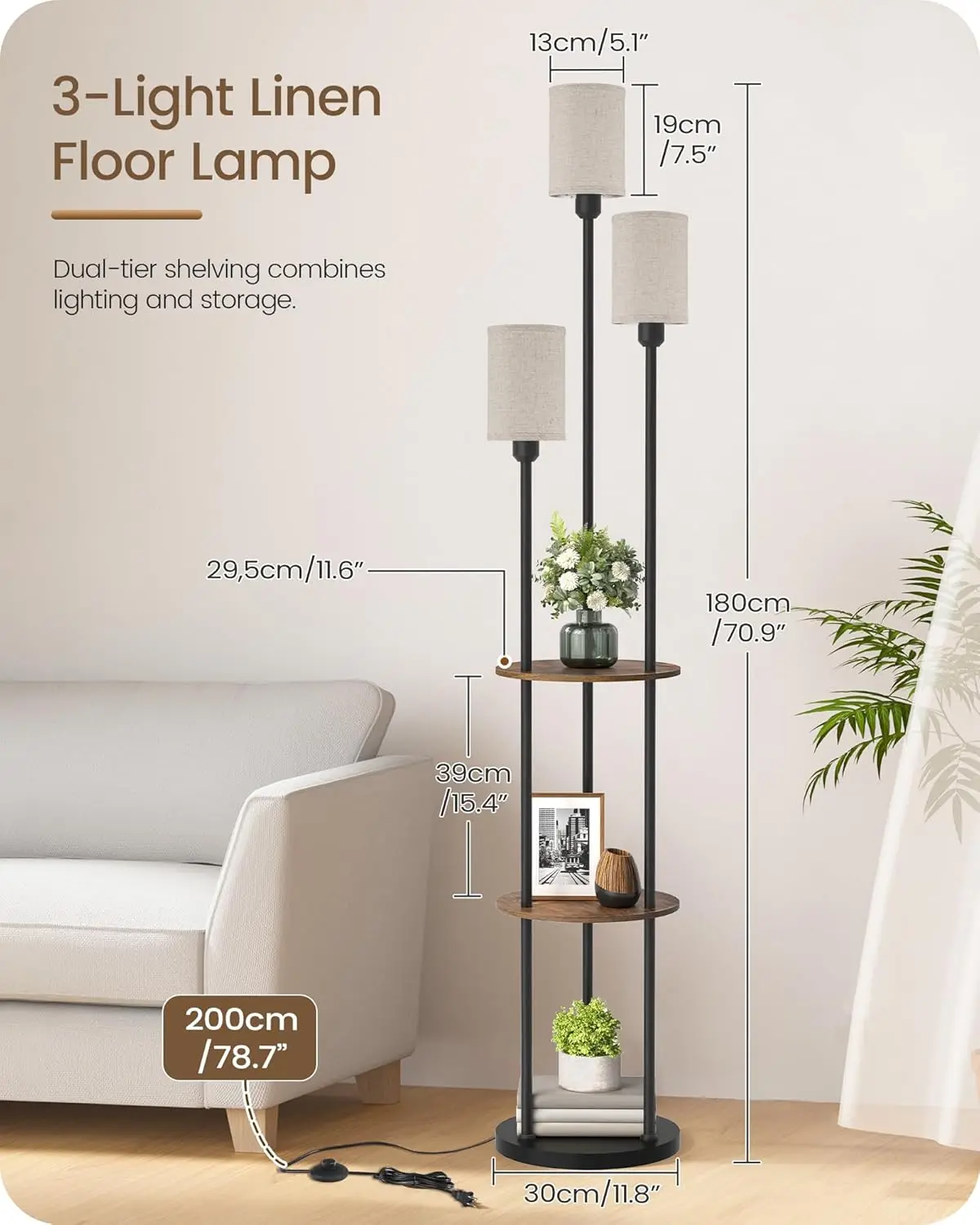 Elevate your home decor with this versatile and stylish floor lamp designed to enhance any space. Key features include: 1. **Spacious Design**: Measuring 70.9 inches tall, this lamp offers ample height for optimal lighting coverage while fitting seamlessly into various room settings. 2. **Functional Shelves**: Integrated shelves provide convenient storage or display space for books, plants, or decorative items, adding both utility and aesthetic appeal. 3. **Soft Illumination**: Equipped with three linen shades that diffuse light evenly, creating a warm and inviting atmosphere perfect for relaxation or focused tasks. 4. **Easy Operation**: Features a convenient foot switch for effortless on/off control without the need to bend down or fumble for switches. 5. **Versatile Placement**: Ideal for living rooms to create cozy ambiance, bedrooms as a reading light, studies for enhanced concentration, or offices to brighten workspaces. 6. **Elegant Finish**: Available in a rustic brown and beige color scheme that complements modern and traditional decor styles alike. 7. **Durable Construction**: Built with high-quality materials to ensure long-lasting performance and stability in everyday use. 8. **Energy Efficiency**: Compatible with standard bulbs (not included) to help reduce energy consumption while providing reliable lighting. This floor lamp combines practicality with contemporary design, making it an excellent addition to any home or office environment.