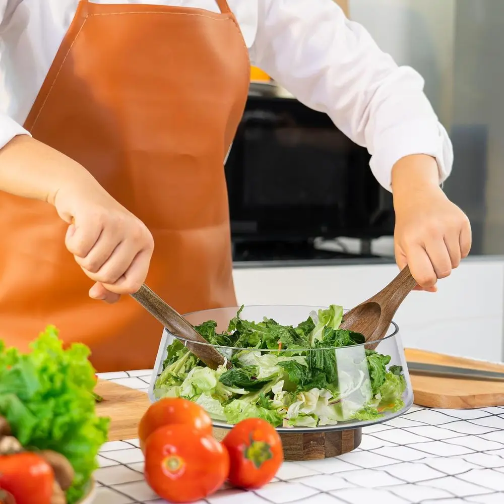 Easy to Clean: The glass salad bowls large serving are dishwasher-sae, the solid wood base requires no special cleaning, and the serving tools are recommended to be hand washed to maintain their natural beauty and prolong their liespan.